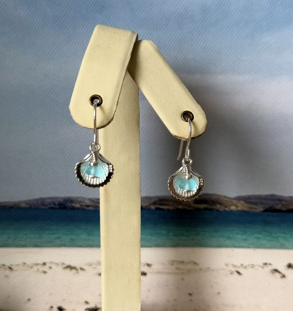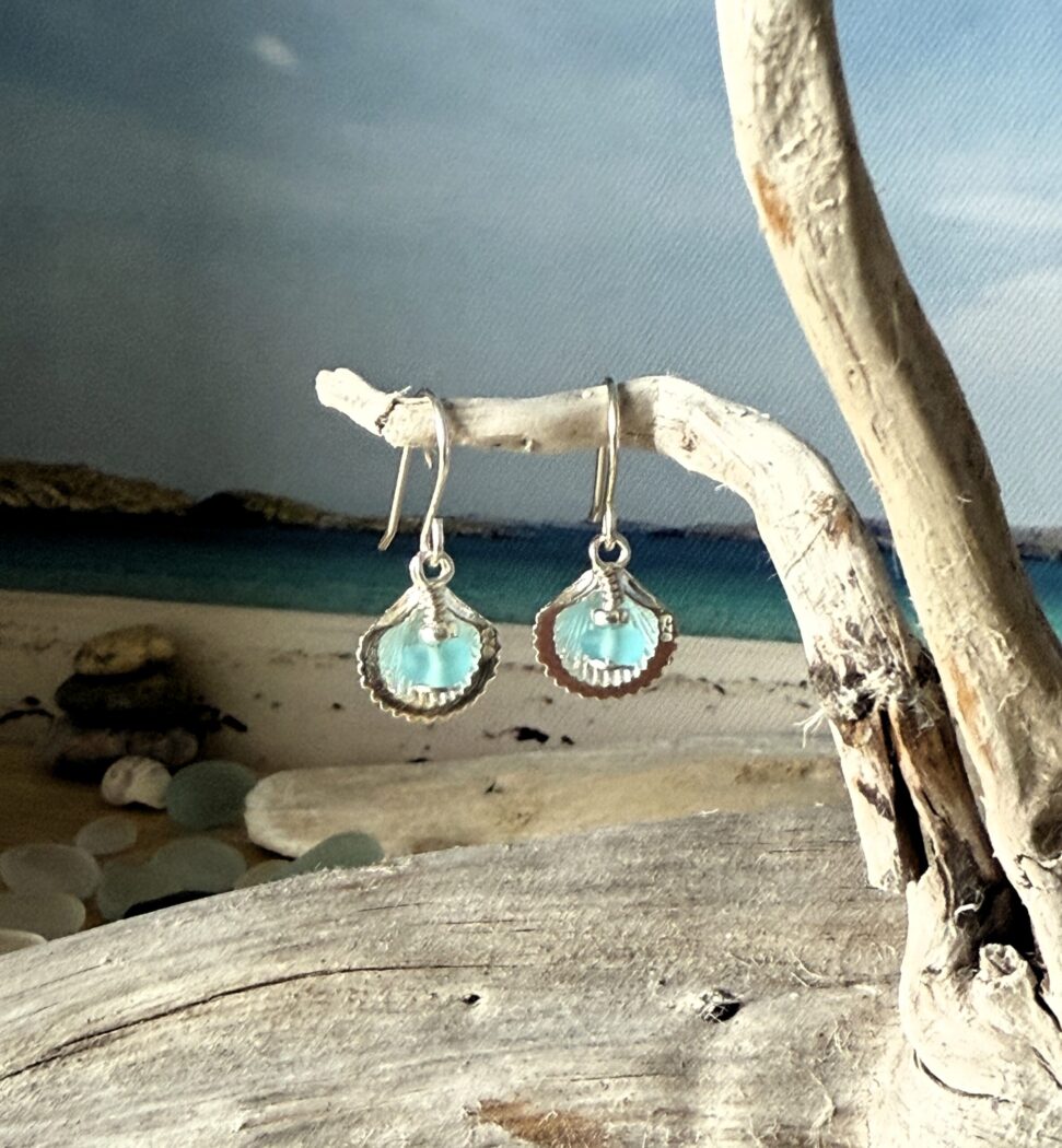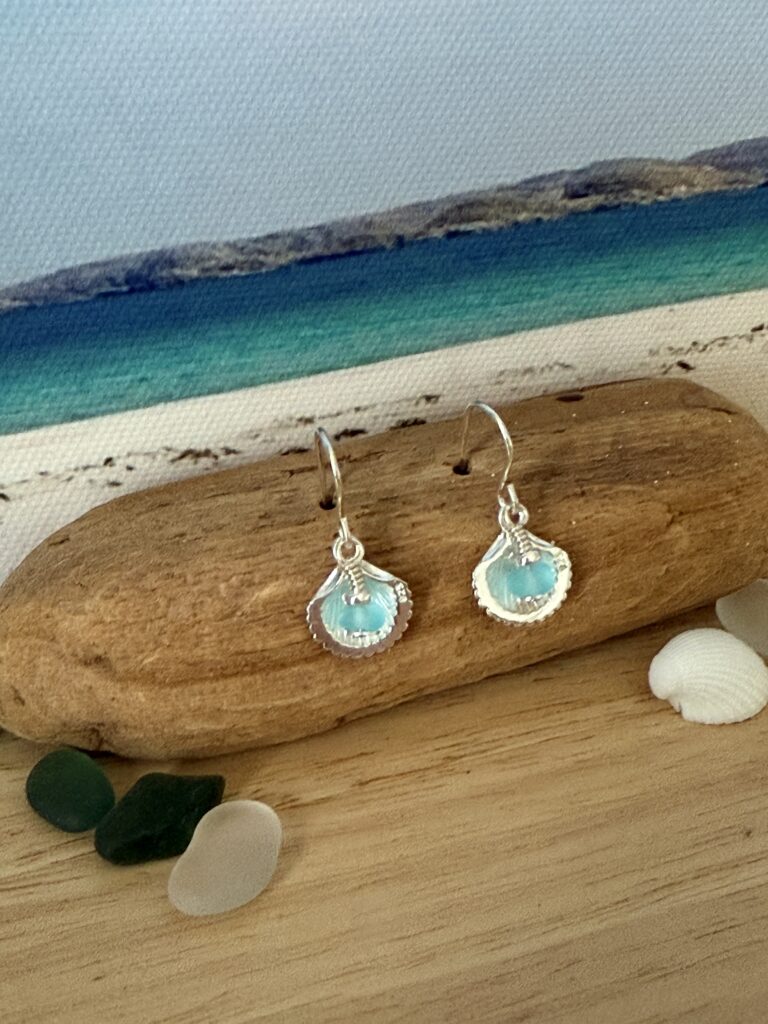 A stunning pair of Hebridean Sea Glass Earrings set with sterling silver shells